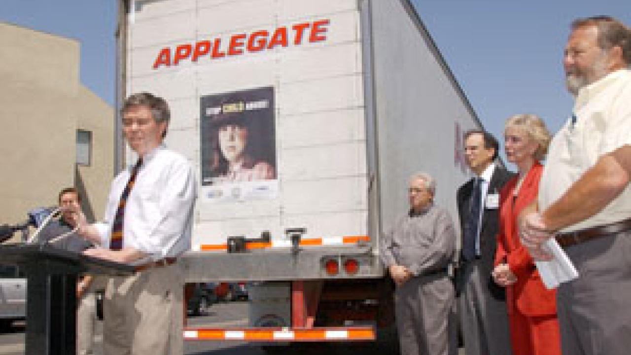Kevin Coulter, medical director of the UC Davis Child and Adolescent Abuse Resource and Evaluation Center, offers comments April 28 as he helps launch a new $10,000 campaign geared toward preventing child abuse. The campaign, funded by the Rotary Club of Davis, will place signs on more than 500 "18-wheelers" that travel across California. It kicked off April 28 at the CAARE Center, located on Stockton Boulevard south of Broadway and the main hospital. Formerly the UC Davis Child Protection Center, CAARE annually serves more than 8,000 children under the age of 18, providing examinations, documentation and medical and therapeutic treatment for victims of domestic violence and child abuse. According to CAARE statistics, in Sacramento County alone, the cost of treating child abuse exceeds $98 million, and more infants and children die from abuse and neglect than any other single leading cause of death. TV news crews from channels 3, 10 and 40, as well as the Davis Enterprise, and KFBK-talk radio were on hand at the launch of the campaign, a partnership between the CAARE Center, Department of Pediatrics, UC Davis Children's Hospital, California Trucking Association and Davis Rotary.