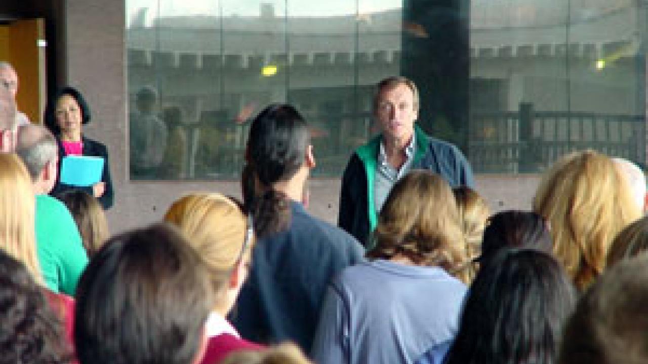 Dean Phyllis Wise, far left, looks on as UC President Robert Dynes speaks with staff, faculty and students at the UC Davis Bodega Marine Laboratory. Dynes visited the facility in late October as part of his continuing Inaugural Tour, which has seen him visit all UC campuses and various major university facilities to meet people and learn about each site. Dean Neal Van Alfen from the College of Agricultural and Environmental Sciences also accompanied the president on the recent trip, which focused on several CA&ES activities in Napa/Sonoma, including a stop at the Oakville Experimental Vineyard and a visit to an area impacted by sudden oak death. Dynes attended a reception with more than 100 alumni from throughout the system that included a lengthy question-and-answer period. He showed much enthusiasm as students, staff and faculty talked about their activities, describing himself as a "kid in a candy store" getting to learn about all of the wonderful and diverse activities undertaken by the university.
