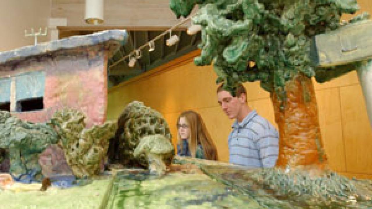 Campus visitors Jillian and Jason Rifkind check out the nooks, crannies and subtle features of The Palace at 9 A.M., a colossal glazed earthenware piece on display in the Buehler Alumni and Visitors Center. The Palace was created by Egghead sculptor Robert Arneson in 1974 and depicts a scene from outside the late UC Davis professor's home, at the corner of Alice and L streets in Davis. The 70-square-foot work was assembled in 17 pieces, each arriving in crates weighing about 300 pounds, says Director and Curator of the Nelson Gallery Bob Riley, who helped with The Palace's assembly last week. Part of the campus's fine arts collection, it will be on display in the center until Oct. 8. The NELSON ARTfriends group has been raising money as part of a $100,000 campaign to complete final purchase of the work.