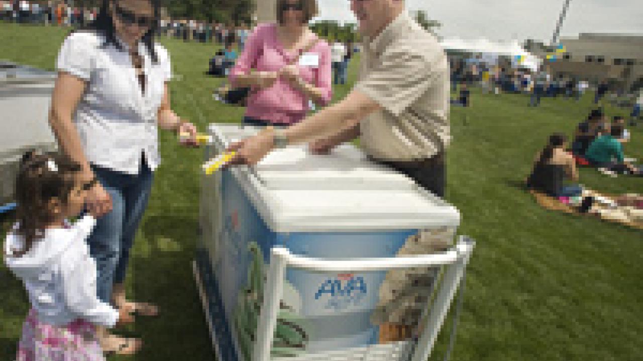This year’s annual staff picnic drew a record crowd of 5,065 to grassy Hutchison Field on May 13, according to Thank Goodness for Staff organizers. On the front: Student Housing staff member Tsuneko Silva spins a bike tire wheel to win a prize. Inside: investigations coordinator Bruce Hupe passes out ice cream bars to Crocker Nuclear Lab staffer Sophia Gersalia and her 3-year-old daughter Dominique Gersalia. To see more photos and a list of contest winners, visit staff.ucdavis.edu/tgfs.