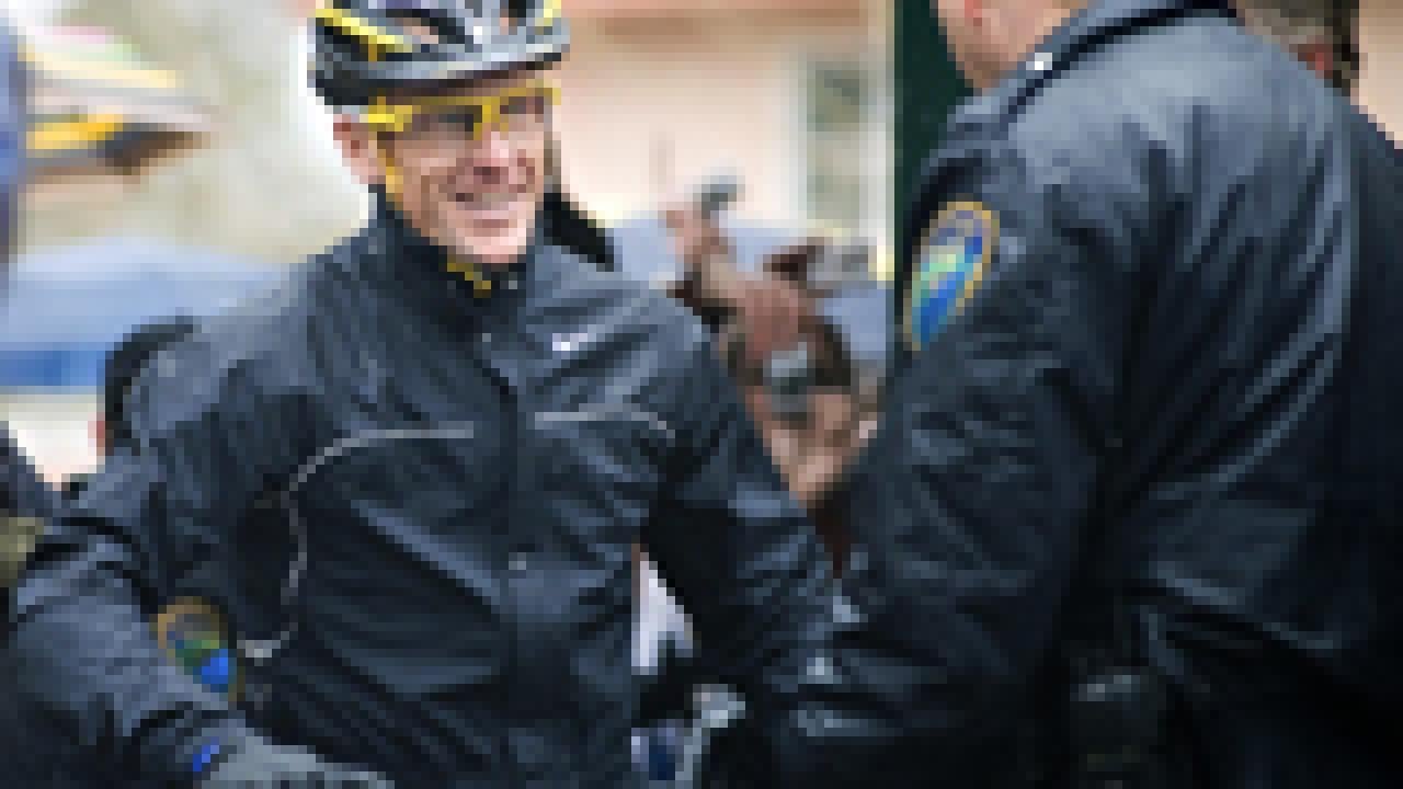 Cycling star Lance Armstrong talks with a police officer after signing into the Amgen Tour of California on Feb. 15. Despite rainy conditions, tens of thousands of onlookers gathered in Davis to witness the 136-rider field embark on the 107.6-mile Stage 1 phase that ended in Santa Rosa later that day. A co-sponsor of Amgen, UC Davis offered help with an academic symposium on the science of cycling, the California Bicycle Museum, and parking and shuttle bus assistance for the Davis crowds.