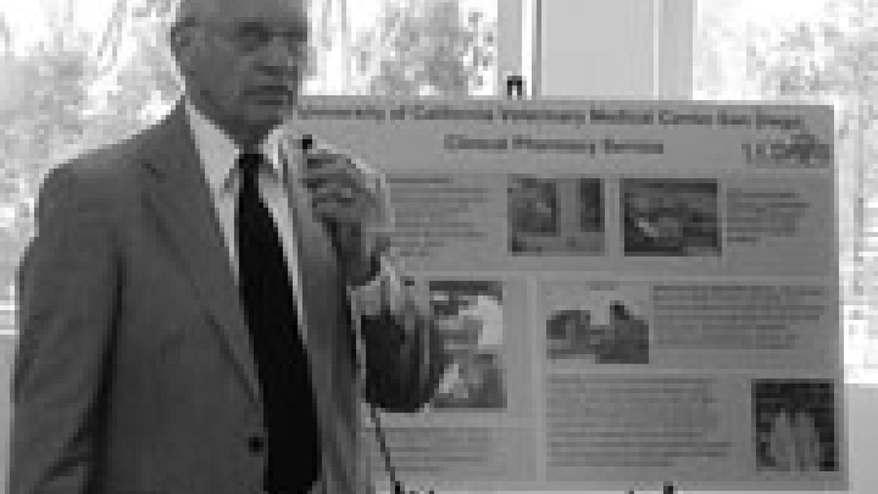 Dean Bennie Osburn of the School of Veterinary Medicine addresses a "Tail-Wagging Reception" last Saturday at the grand opening of new clinical facilities for the UC Veterinary Medical Center-San Diego. More than 100 guests, including a dozen animal companions, gathered for the celebration. Area veterinarians, benefactors, university officials and former clients from as far away as Bishop toured the facilities and met with center clinicians who had treated animals for kidney or behavior problems. Center officials introduced emerging pharmacy and clinical nutrition services for Southern California clients. About 20 Davis-based guests participated via teleconference between San Diego and the School of Veterinary Medicine on the Davis campus. The School of Veterinary Medicine and UCSD established the UC Veterinary Medical Center-San Diego in 1998 as a joint venture designed to promote specialty veterinary services and enhance veterinary education and comparative medical research. The UC program occupies 4,000 square feet in the new 26,000-square-foot Veterinary Specialty Hospital of San Diego.