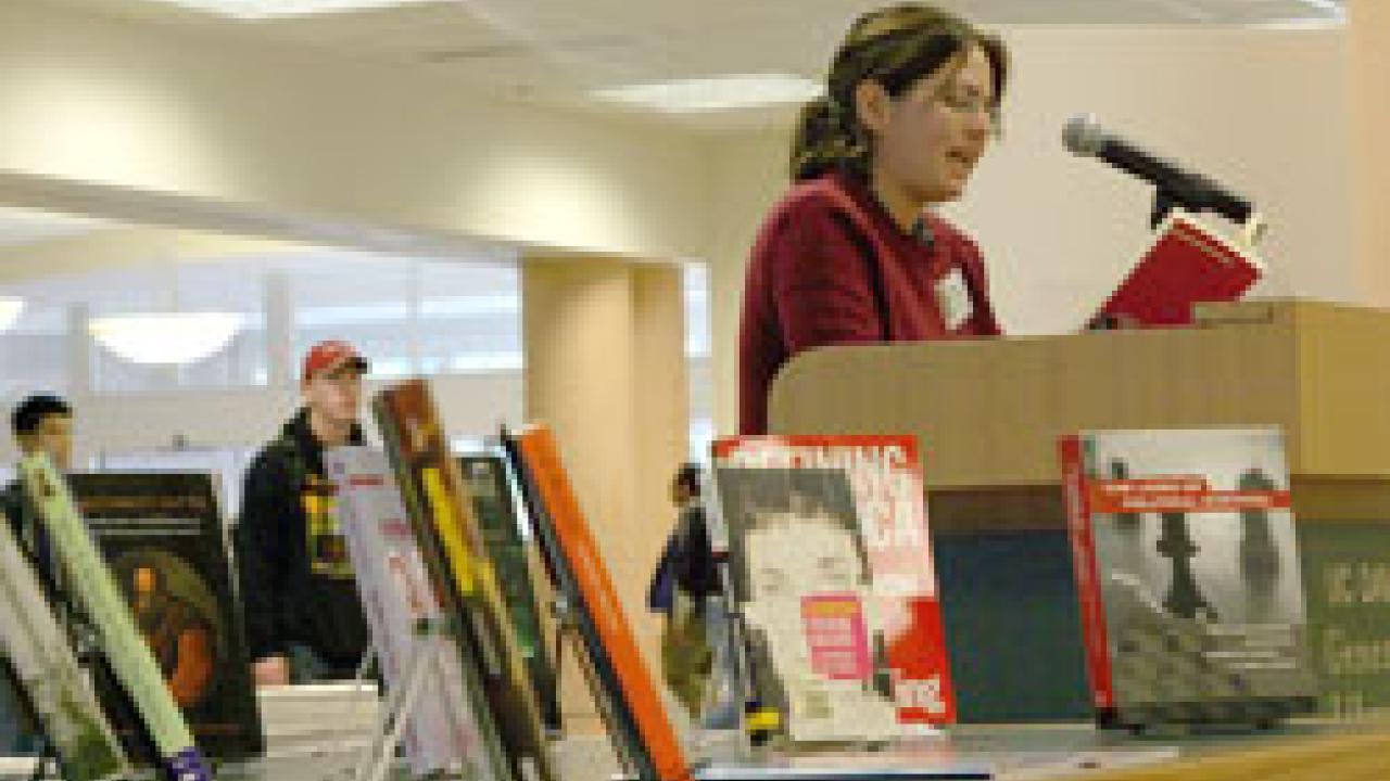 About 120 people gathered in Shields Library last week to get a feel for the range and high quality of writing at UC Davis. The 13th annual Campus Authors Celebration included a display of about 120 new books. Thirteen of the authors stood before the audience, often prompting laughs, as they offered anecdotes from their writing experiences -- lasting anywhere from a month to 10 years or more. "These authors enrich our lives by sharing their talents," Provost Virginia Hinshaw noted, thanking them for taking the risk inherent in sharing one's passions with the world as she helped to open the Oct. 21 event. Topics varied widely, from Miroslava Chavez-Garcia's history of Chicanas in California to Dean Simonton's take on cultivating creativity in science. Andrew Waterhouse discussed his text on wine color, noting that research shows the redder the wine, the better people rate its taste. And Lucy Corin, below, of English read an excerpt from her novel Everyday Psychokillers: A History for Girls. At right, Robert Avalos of the Division of Biologi-cal Sciences thumbs through some of the books on display. For more, see http://libweb2.ucdavis.edu/dept/admin/campus-authors/.