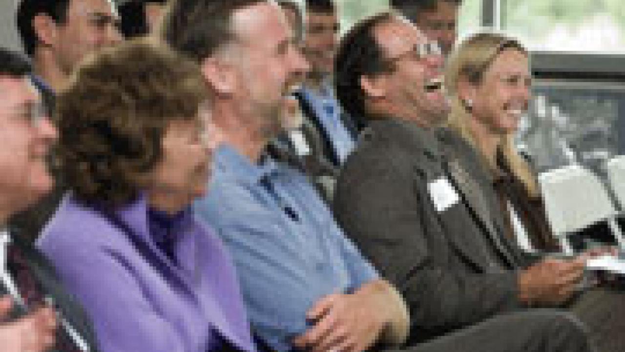 Geology professor Jeff Mount, second from the right, reacts to a comment at the Oct. 26 grand opening of the UC Davis Center for Watershed Sciences. Mount is also the director of the Watershed Sciences Center. Left of Mount is Mike Eaton, a senior project director for The Nature Conservancy, and state assemblymember Lois Wolk (D-Davis). On Mount's right is his wife, Barbara Evoy. Work conducted in these labs will play an important role in decisions about watersheds, river systems, and California's native freshwater fishes. For information, see http://watershed.ucdavis.edu.