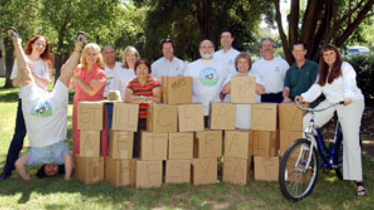 A head-over-heels Susie Gaines proves she's "Still Crazy After All These Years" -- the theme of this year's TGFS festivities -- as she poses with other TGFS committee members Tuesday. The TGFS picnic is set for 11:30 a.m. to 1:30 p.m. Wednesday, May 12, in Shields Grove, at the west end of the arboretum. Free to staff, the event will feature a menu of fried chicken, vegetarian pasta, potato salad, rolls, ice cream sandwiches and more. A prize will be awarded to the attendee who guesses closest to the weight of this scene: including the people, the bike and the boxes -- which contain campus phone books. Also in the photo are, from left, Bethany Daniels, Michele Reynolds, Gil Apaka, Donna Carrasco, Puriie Conley, Mark Ottinger, Michael Buck, Zack O'Donnell, Laura Townsley, Bob Lance, Peter Brinckerhoff and Kathy VonRummelhoff. For more about TGFS activities, merchandise and contests, as well as the schedule for trams running to and from Shields Grove for the picnic lunch, see http://staff.ucdavis.edu/tgfs.html.