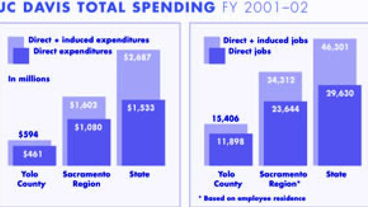 For every two direct jobs at UC Davis, another job is created in the state of California. And for every dollar that state government invested in the campus, UC Davis returned $5 to the state economy. "It is compelling to realize the state receives a five-fold return in economic activity for each dollar invested in UC Davis," said John Meyer, UC Davis vice chancellor for resource management and planning.